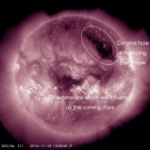 We will likely continue to see coronal hole high speed stream effects for the coming three days. The Kp-index will likely remain elevated as well and we can not rule out an isolated period of minor G1 geomagnetic storming conditions as long as these coronal hole high speed streams continue to influence Earth.