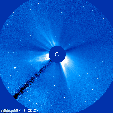 There are some gaps in the data from SOHO but we can see a faint asymmetrical full halo coronal mass ejection (CME) racing