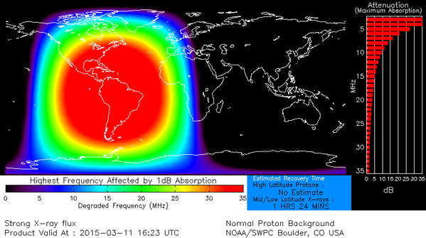Region 2297 produced a major X2.2 solar flare peaking at 16:22 UTC Wednesday. The event was responsible for a brief R3 level radio blackout on the sunlit side of Earth. The active region is now in a good position for Earth directed eruptions. More details to follow regarding a possible coronal mass ejection (CME).