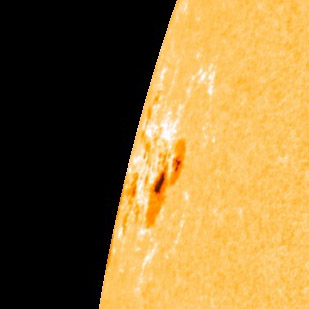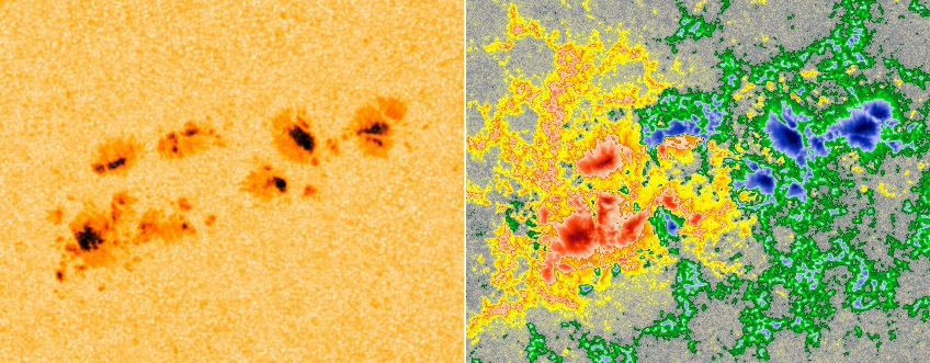 Images: Sunspot region 2335 as seen by NASA SDO. Visible light (left) and magnetogram (right).