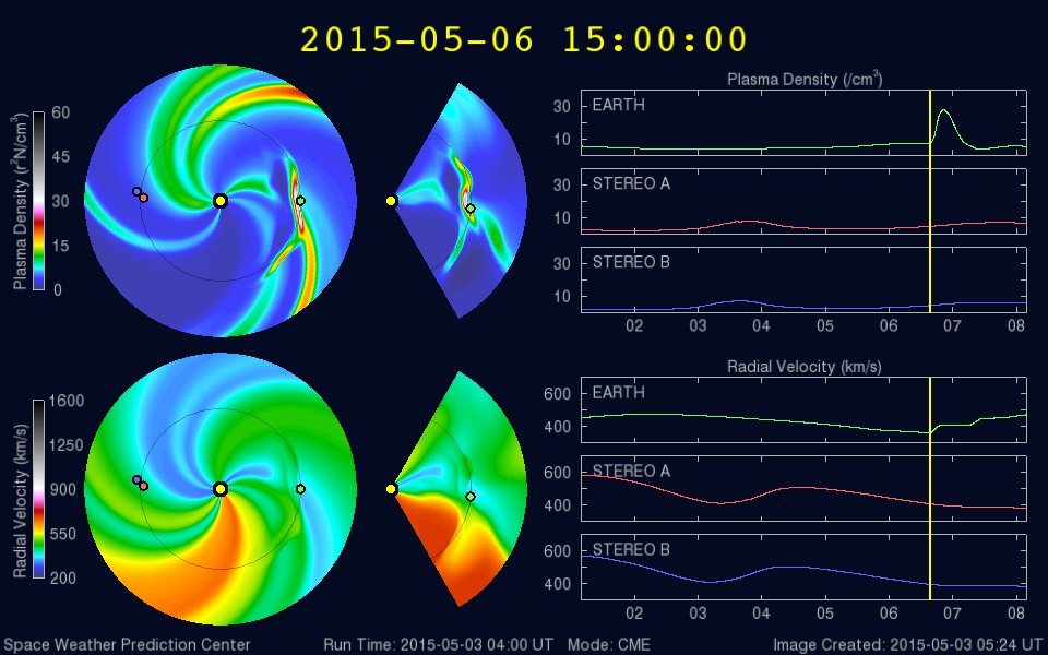 A weak coronal mass ejection from a filament eruption that occured a few days ago could arrive in the coming 12 to 36 hours. The low energy protons and electrons as measured by ACE EPAM are rising indicating an approaching plasma cloud. The coronal mass ejection is heading mostly south of Earth as seen on SOHO coronagraph imagery but a weak glancing blow can not be excluded. Geomagnetic storming is not expected. Below a still of NOAA's ENLIL model showing the incoming CME.Image: NOAA's ENLIL model showing a possible glancing blow CME passage.